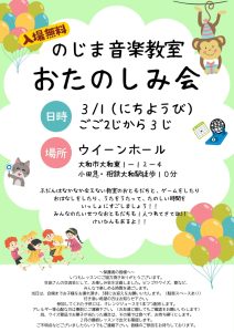 のじま音楽教室では、普段はなかなか会えない教室のお友達どうしの交流、そして新規ご入会のキャンペーンも兼ねて、外部からのお友達も一緒に参加して遊べる会を年に1度企画しています。